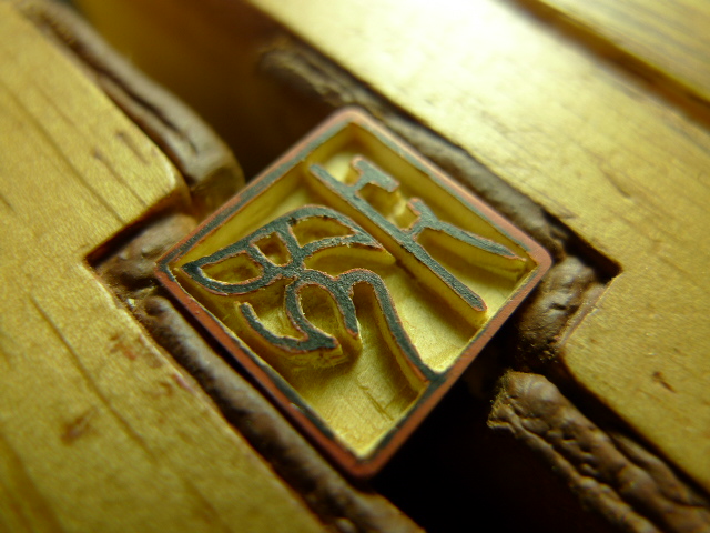 辞書から選字して、草稿を経て印面に入れる文字を決めます。 その後、印材に字入れをして印面上で朱墨と墨で文字の曲線や、線の傾き、空間などの1mm以下の細かい修正を行い字入れを終えると粗彫りに入ります。