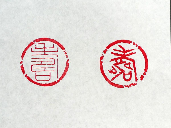 角井先生に見せると駄目とは言いませんでしたが、すぐさま右手の細い篆書体で作ってみろと助言を頂き2つ目となる左側の印を作りました。