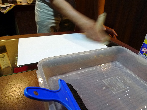 作品を書く紙は薄いので額に入れる前に厚い紙と糊で貼り合わせます。