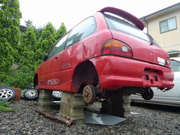 部品取りの車から部品を取り外し中で車の下に潜って作業が出来るほどブロックを積んで車体を上げてました。 今回の台風8号はかなり大きく九州横断して宮崎に直撃しそうなので、このままだと突風で横転しそうなので下げることにしました。