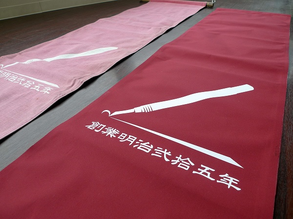白い塗料でロゴを入れたらインクが暖簾にのらないのでプリントTシャツの機械でプリントしたら上手くいったそうです。