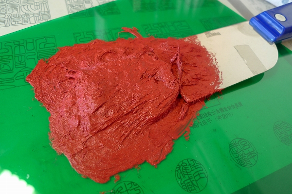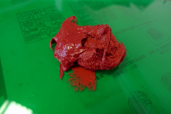 油分の少ない印泥は固いのでこねる事が大変です。以前は30分かけて肩こりしそうになる程の労力でした。