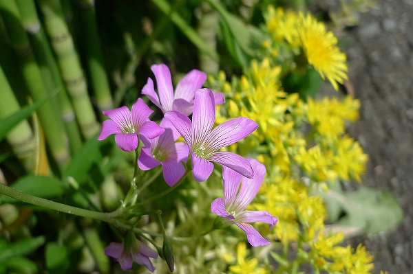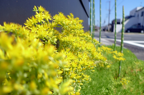 父が植えた低い位置で横に広がる明るい緑の植物が、今年は黄色い花を一斉に咲かせてます。