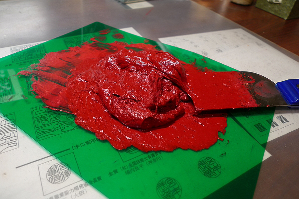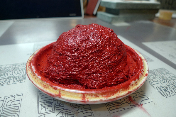 1分でいい感じにトロトロになります。それを鉄のヘラで押し潰す様にこねていきます。 30分ほどこねると固い印泥の固まりが無くなってきて混ざり合った感じがしてきます。そこから更に10分ほどねって完成。