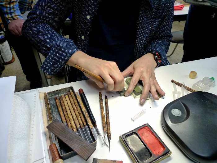 1級技能試験の課題が上手く出来ているので、更に上手くなって貰うように仕事レベルの仕上げを見せようと本人が使っている道具を使って仕上げを掛けようとしたが、印刀を間違った刃の付け方をしていたので急遽、研ぎ方から刃のつけ具合などの指導に変更。力の入れ方、角度、裏の付け方をやりながらの講習。