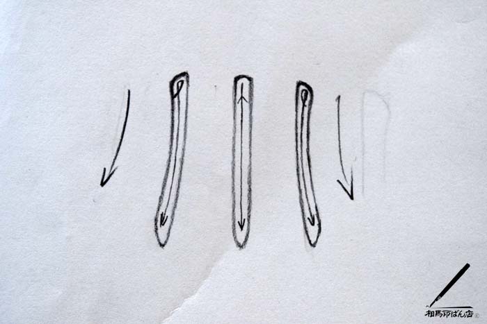 篆書体の線の形は、左に曲がる場合、真っすぐ下す場合、右に曲げる場合で筆の動きが変わります。その特徴を理解して下さい。