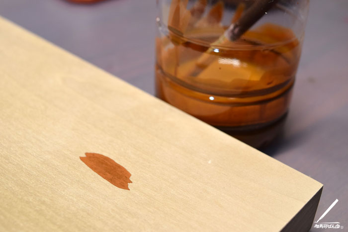 かき混ぜた混合液を板の裏面に塗って色の確認。