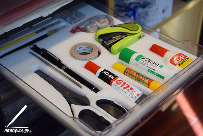 引出しの高さを有効活用して、立てて納まるゴム印などは立て収納。