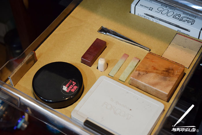 今回、使う頻度や、取り出し易さを考えて作ったつもりでしたが、万年筆と、鉄のヘラの位置をミスってしまいました。ハサミの左側のスペースを使えば、マスキングテープの上のスペースが左右に広く取れてカッターが納められたのに…。