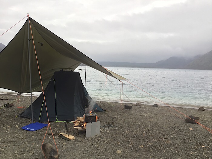 まずは、テント内の荷物を全て外に出して、テントのペグを抜き一気に畳にかかる。また撤収を開始すると時より突風が吹く。だが、タープのお陰で濡れずに畳んだテントをバックパックに詰めると、あとは小物をサクサクと入れられバックパックへの収納を終える時に強烈な突風でタープが倒れた。