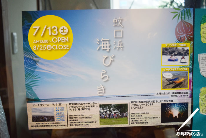 2019.06.19 海びらき 昨日、観光協会の方がポスターを配布に回られてました。高鍋の蚊口の浜は、7月13日(土)に海開きです。また、7月に入ると毎週末、祭りやイベントが開催されます。早い梅雨明けを期待したいですね。