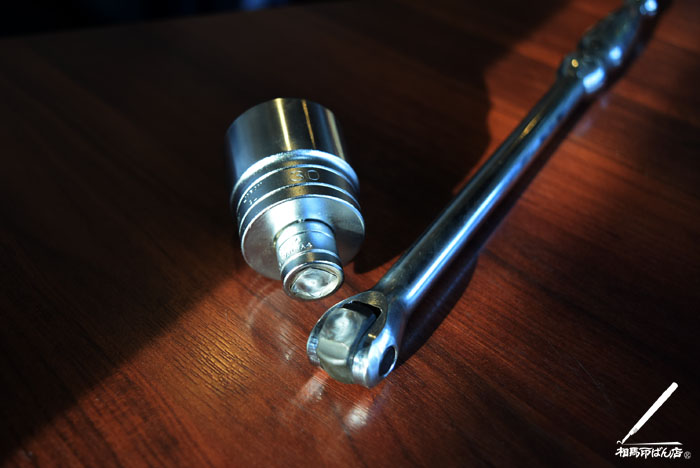 タイヤを見ると中央奥側にセンターナットという30mmの大きなナットでドライブシャフトが固定されてますが、それを緩めようとしたら工具が破断してしまって早々と作業終了…。