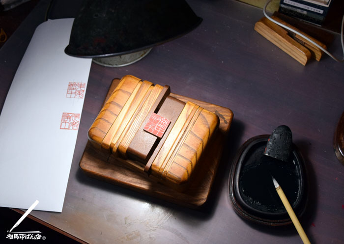 毛バリという道具で印面に印材に傷が付かない程度に軽くあてて引くと、印面に塗ってある朱墨の部分に軽く傷がつき引いた部分が銀色に光るようになります。