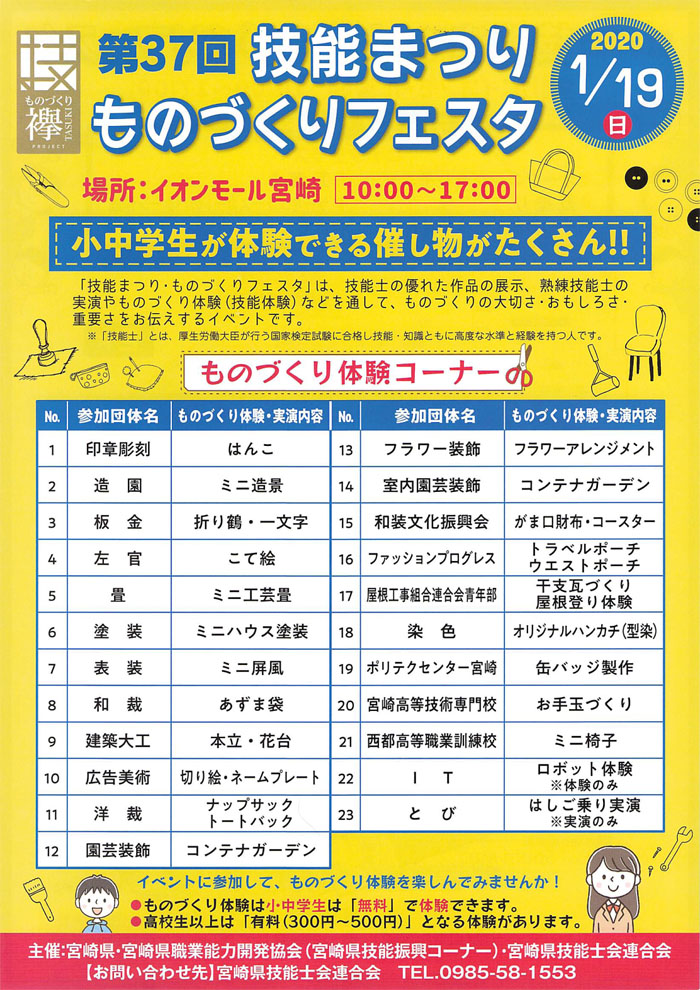 19日(日)にイオンモール宮崎で色んな職種が集まって物づくり体験イベントが開催されます。