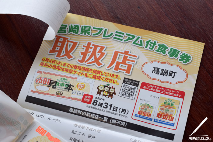 宮崎県プレミアム食事券の有効期限は、8月31日までとなってます。