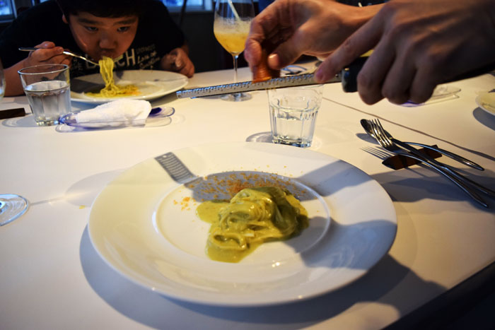 バジルのパスタにカラスミを掛けているとこです。