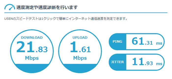 17時30分頃で、下り21.8Mbps、上り1.6Mbpsと、自分が使う範囲では早いくらい…