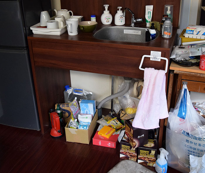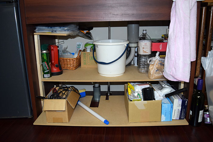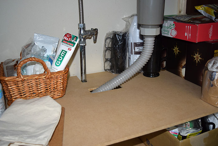 店舗2階に流し台がありますが、簡易的に作り付けでつくって貰ったので下に扉や棚はなく物が散乱してました。それを見かねたスタッフUさんが、棚を作る!ってことになりお任せしました。