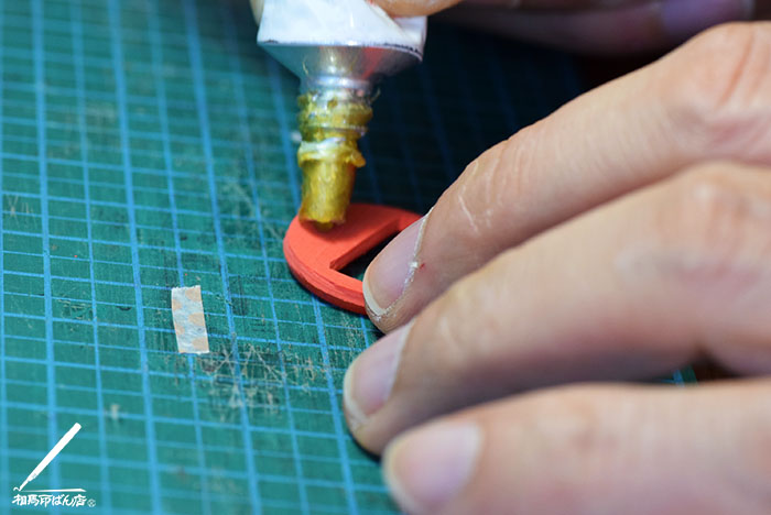 カットしおえたゴムの裏にボンドを塗って本体に接着。