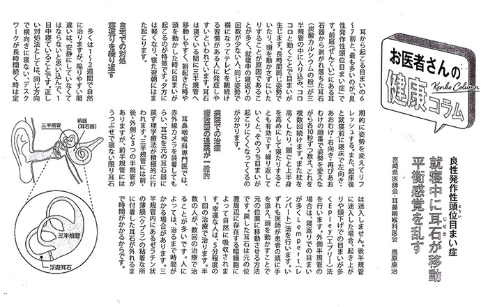 診察の終わりに鳥原先生が書いたコラムを渡されて、耳石を取り除く運動を教えて貰い診察を終えました。