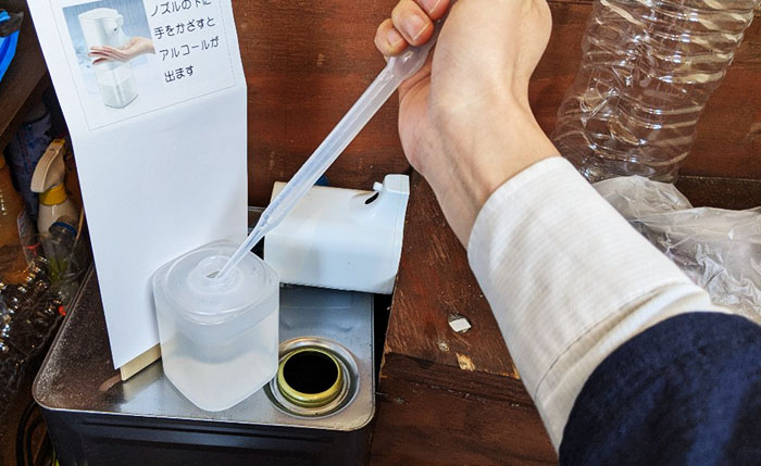 今朝、店舗入口のドアノブに設置したアルコールの自動噴射機にアルコールを補充したところ重さが増してドアノブに掛けれなくなりました。