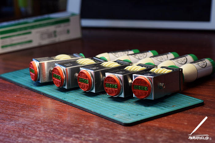 データ印は、ゴムの印面を貼って完成でなく、赤い印面と、緑の日付けが変更できるベルトの高さ調整をして高さを整えたら、日付けを合わせ取っ手部分にある見出しに印面を印字させて完成となります。