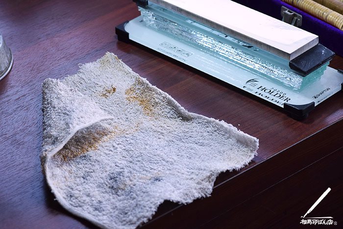 白い粉は砥石が削れたものですが、細かい粉末状で吸うと良くなさそうなので、使ったら洗うようにしてます。なので、洗い易いように小さく切った布を使ってます。