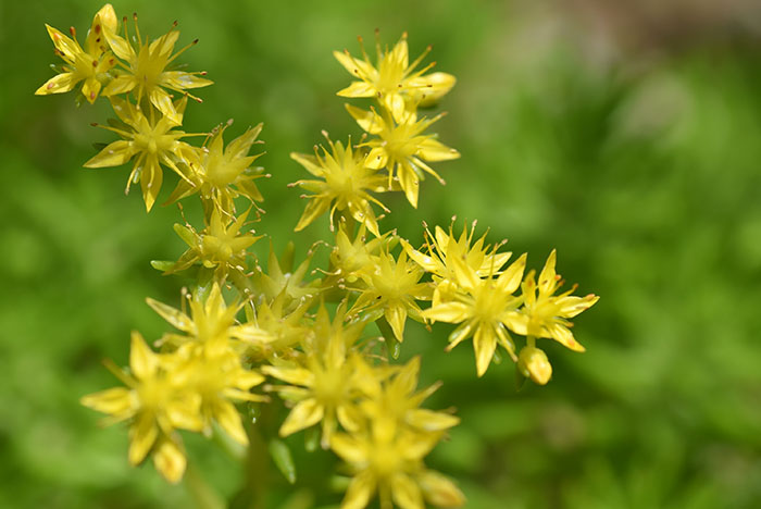 明るい緑色をした六条万年草植物が少しづつですが繁殖しはじめてます。その六条万年草から茎が10cmほど伸びて黄色い花を咲かせていたので、撮影してみました。