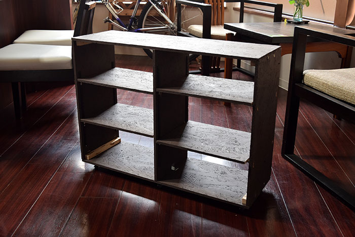今回は、板と板を組み合わせるのに角材を角に配置して組み立てましたが、2台目は、金具と釘を使った止め方と、スリムビスを打ち込むやり方の2通りで組み立ててみようと思います。