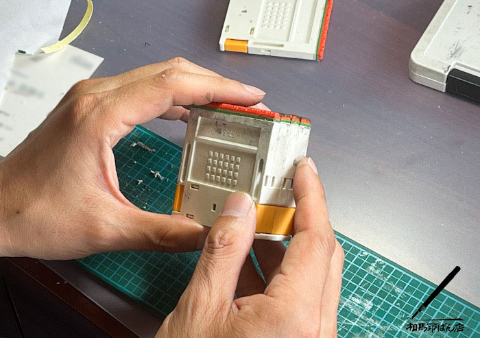 高さを合わせたゴム印を台座に貼り合わせたら指で触って確認。