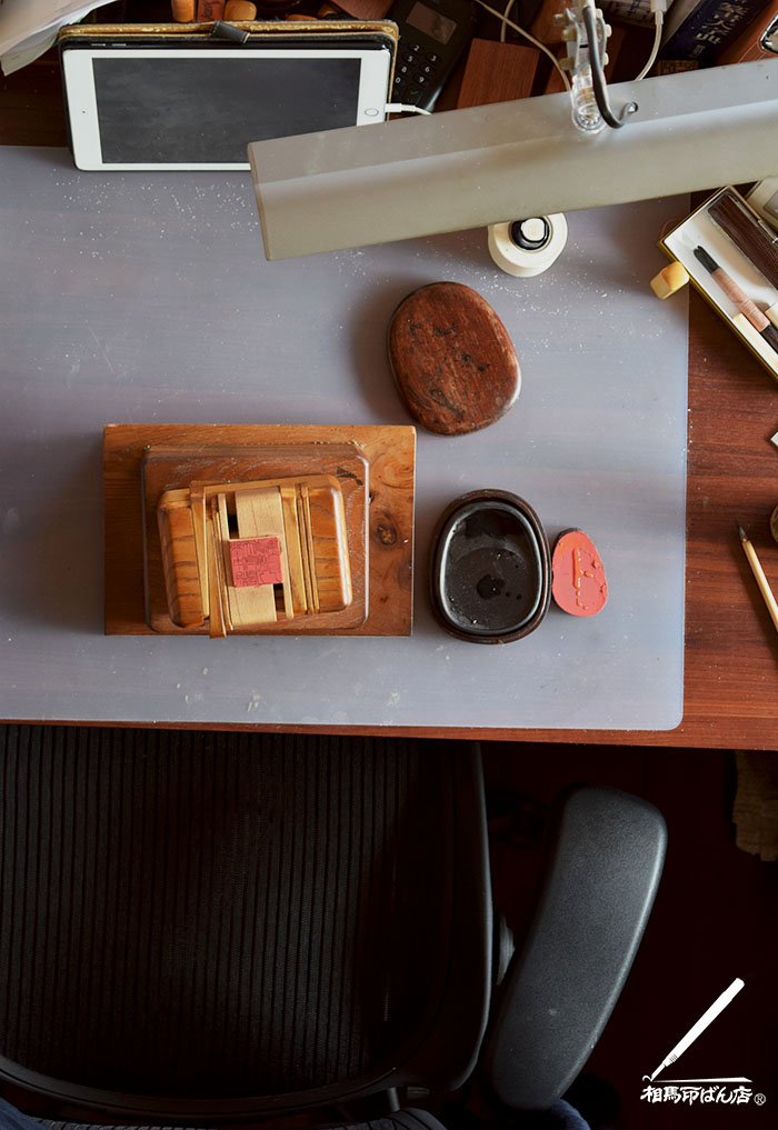 再度、1寸2分角の角印に熊本城天守閣修復工事完了と12文字の字入れをはじめました。3本は彫る予定なので、2本目も練習用の材料にしてます。