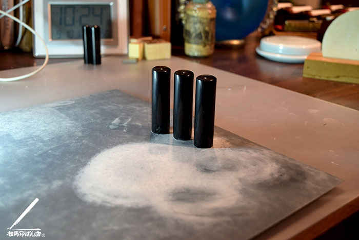 昨夜は、仕事がひと段落したので、最後に黒水牛の印材の印面をサンドペーパーで平らにする作業をして、平らになった印面に朱墨を打ちおえてから店を出ました。