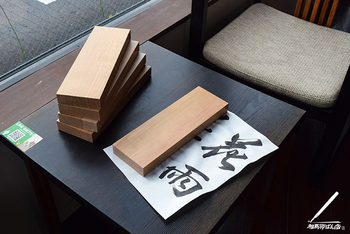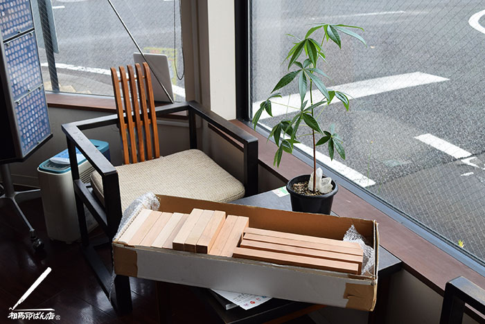 その時、依頼していた表札の板と、来年3月に全日本印章技術競技会に刻字の部門で出品する板がカットされ、最後に保護剤を塗るので保護剤が届くのを待っている状態でした。