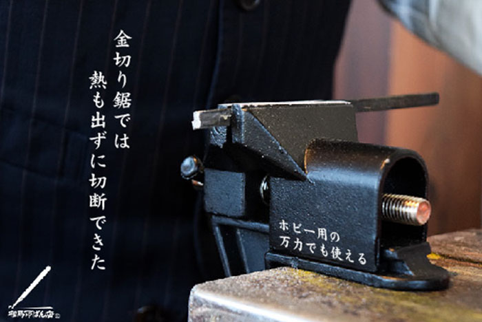 まずは、修正液で切断する部分にしるしを入れて、万力で固定。