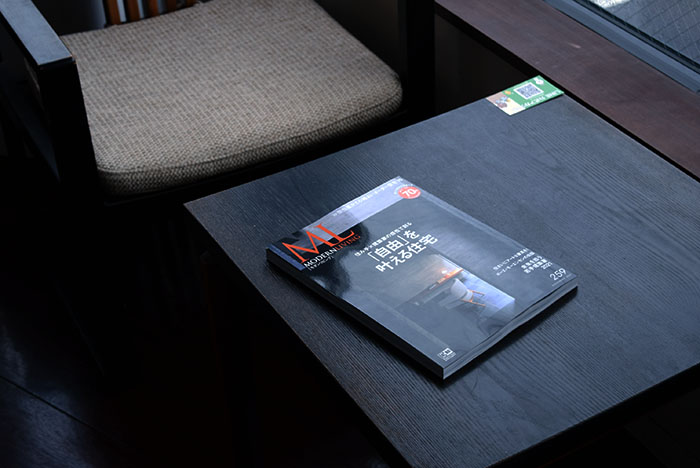 窓際の席は待合席で使うことが多いのでモダンリビングって雑誌を置いてます。年6回の発行で、本屋で見掛けると買ってきます。