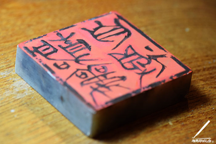 刻すセオリーは、文字の線(残す部分)側に印刀を寝かせて引くことで線がスパッと切れ、反対側は不規則に欠けていきます。