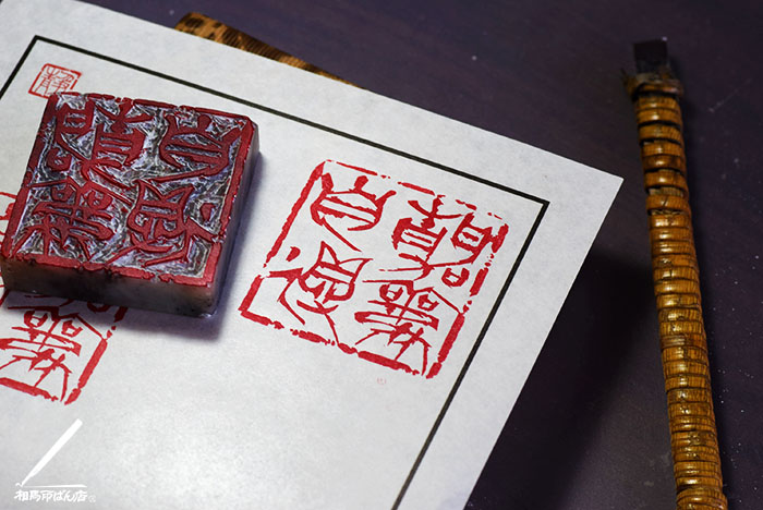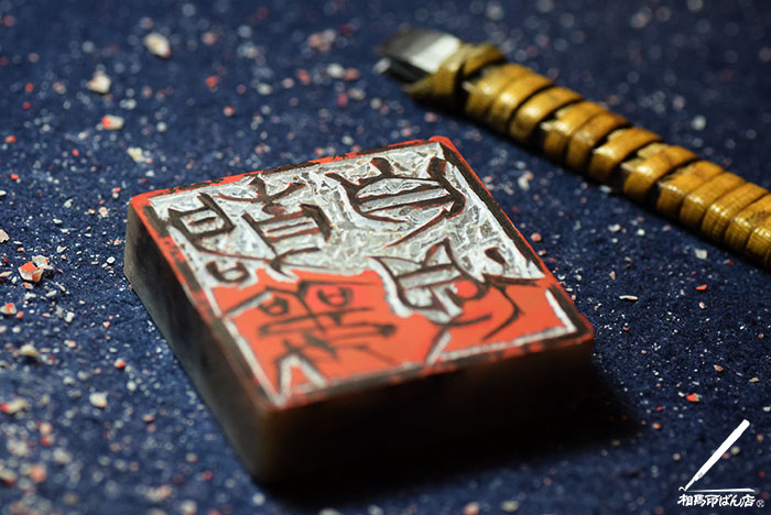 印材がスパッと切れる印材なので偶発的に起こる欠けが出難いので、わざと残す文字の線と反対側に印刀を倒して線に偶発的な欠けが出ないかやってみました。