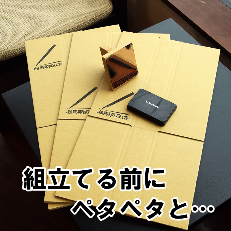 段ボールを組立てる前にペタペタとゴム印をおす