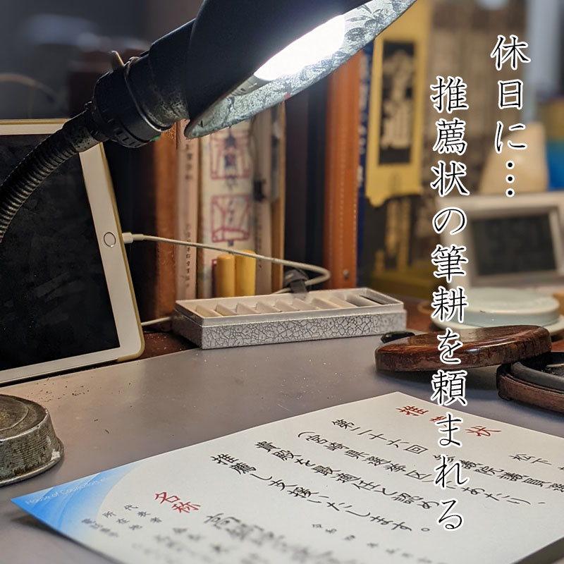 参議院選が近づいているので推薦状の筆耕を頼まれ、朝から店に出て書いてました。