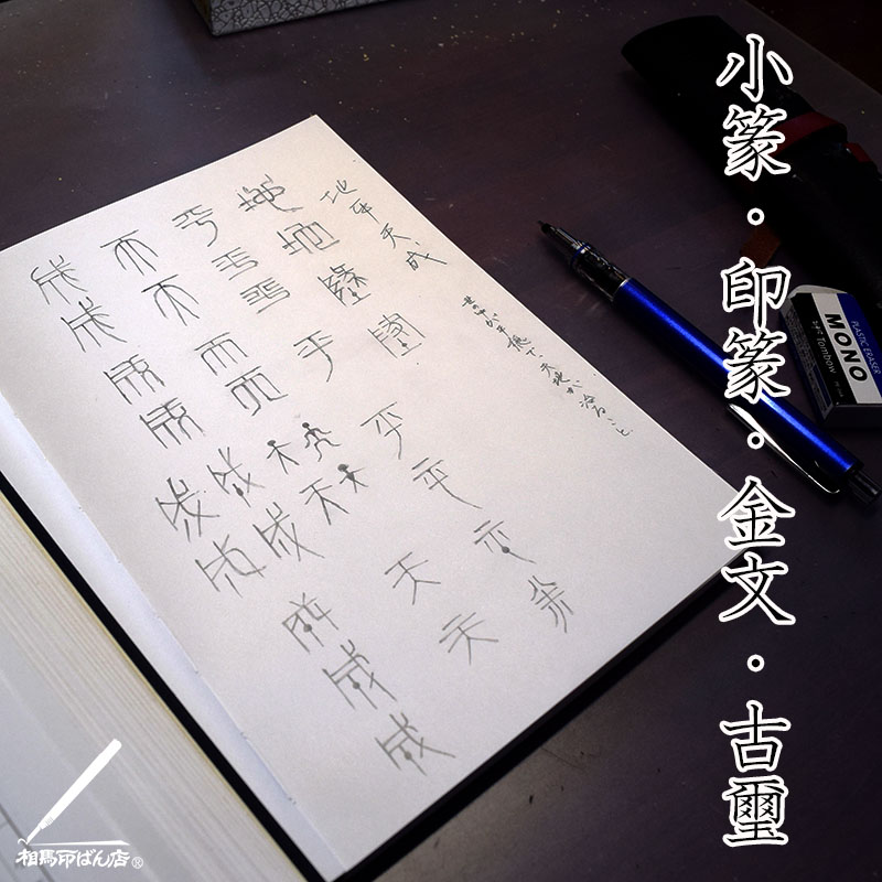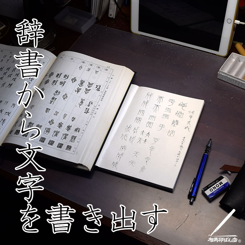 作品をつくる際は、辞書から小篆・印篆・金文・古璽の4書体を拾い出します。また他に2、3冊の辞書から字形を調べることもあります。