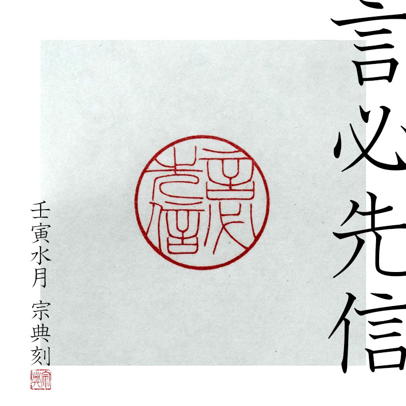 4文字で言が2つ入っているから、篆刻として形を変えて入れるが、言の字形は下部の口(サイ)の形が異なるぐらいで、4文字配置させたらその変化が使えない。中央の空間をUとVの形で変化を付けるかになってくる。