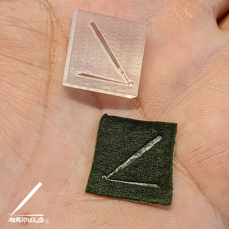 同業の友人にレーザー彫刻機があったら革にロゴを焼きこんで印鑑ケースに貼りたいと、話したら、それならレーザー彫刻機でアクリルで凸版を作って万力でプレスすればいいですよと、助言を貰った。