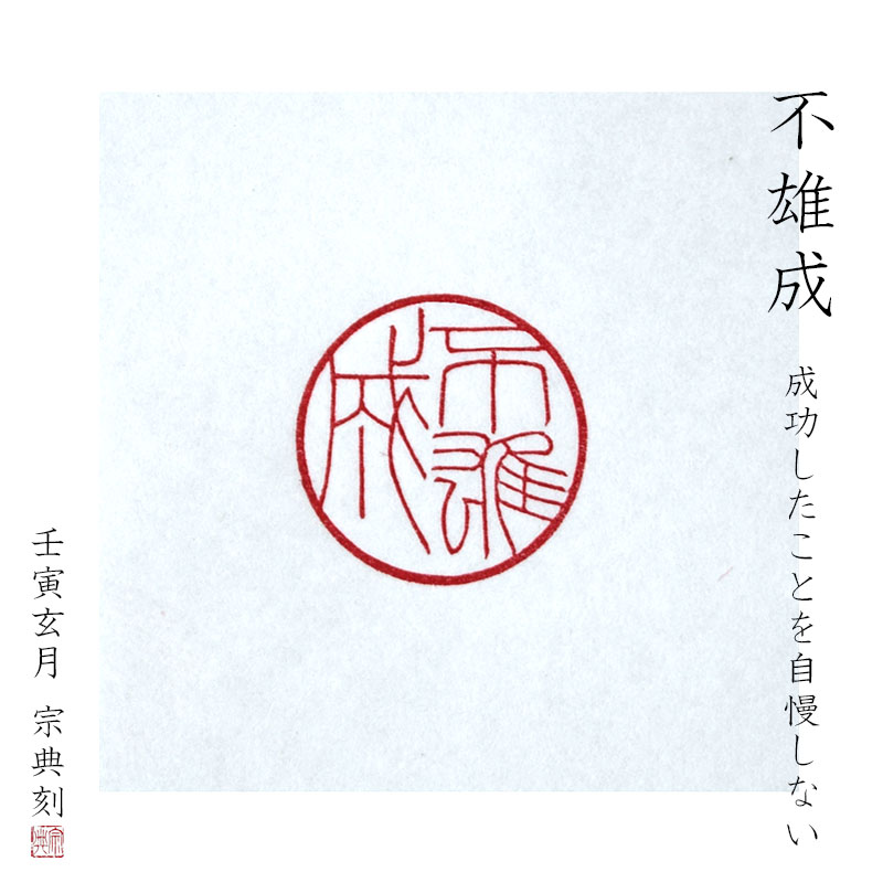 2022.09.05 不雄成:成功を自慢しない 第120回 8時だよ全印集合のお題は「不雄成」 意味:成功を自慢しない。 自慢したいが、成功事例がない…orz ブログランキングに挑戦中です。ポチッポチッと、応援よろしくお願いします(。-人-。) 中枠の細字でつくりました。 3文字ですので1行目に2文字、2行目に1文字の構成でデザインしました。 また成を上下いっぱいに伸ばすと変なので、上下に空間を設けてみました。 松月生夜涼 知者動を円に納める