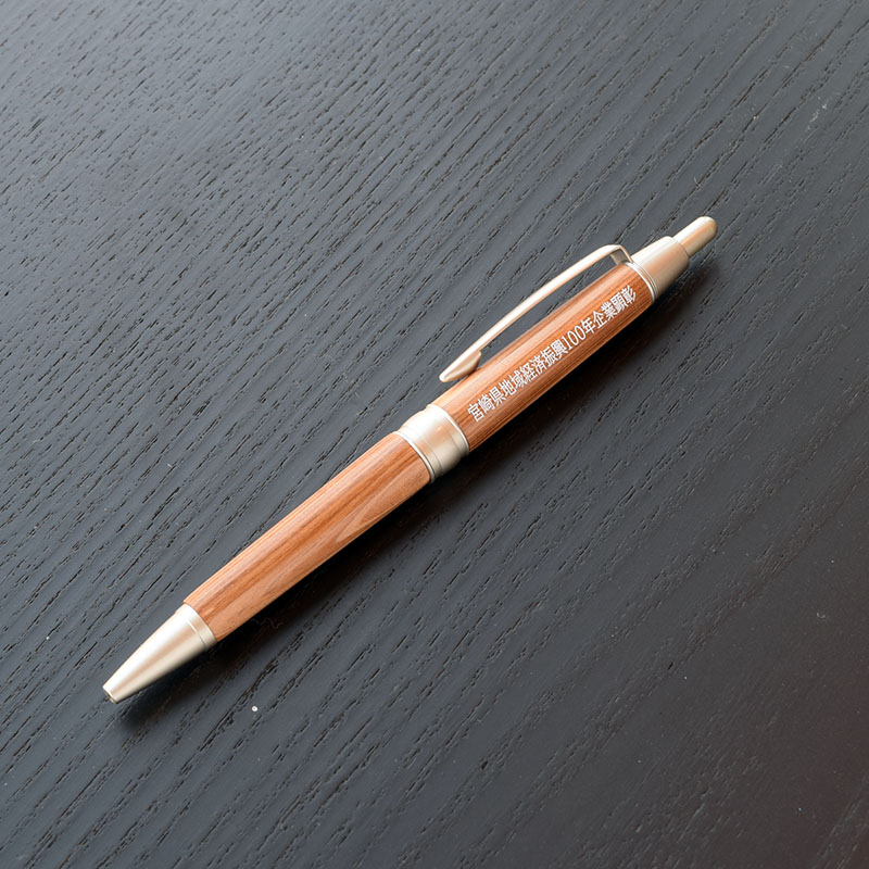 頂いた手提げの中には、額縁と、記念品が入っており、記念品の箱を開封すると宮崎県産杉で作られたボールペンでした。