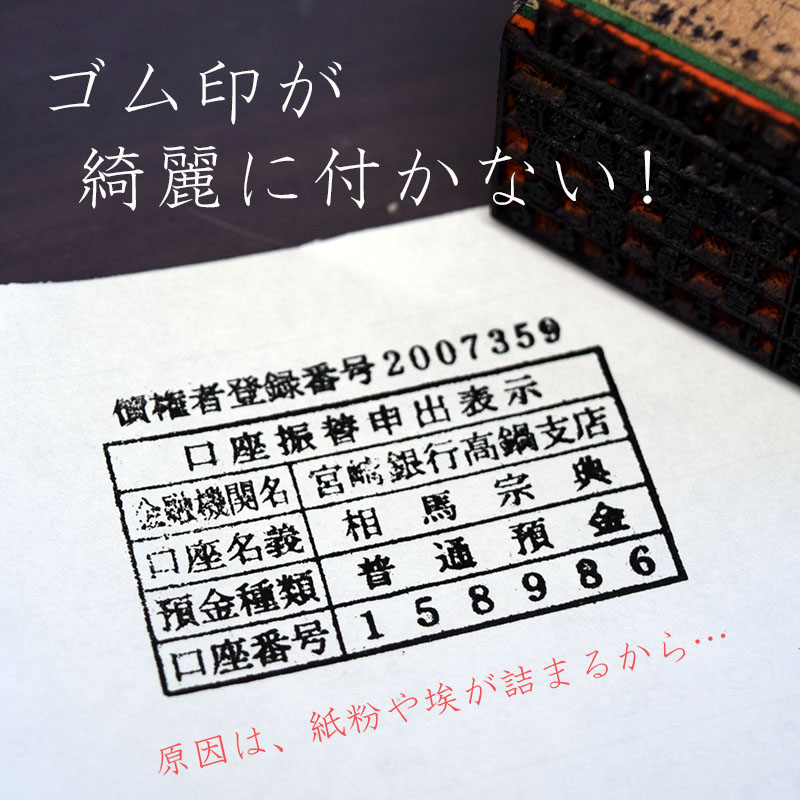ゴムは、大気中の水分と反応して分解が起こり、最終的には硬くなってひび割れしたり、印面が崩れたりします。他に使い込んで角の文字がすり減ったりして捺印ができない状態になっていることがあります。