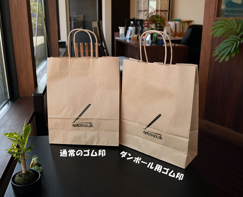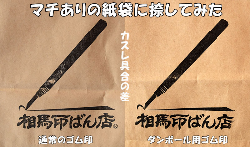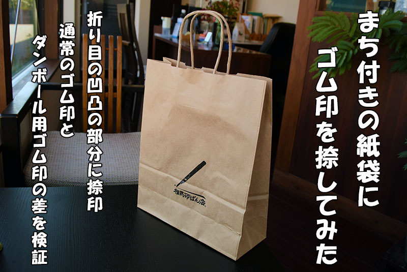 まち付きの紙袋の下部にマチの部分に折り目が付いてます。この折り目の凹凸に押すとカスレが生じますが、通常のゴム印と、ダンボール用ゴム印でどのくらいの差がでるか検証してみました。
