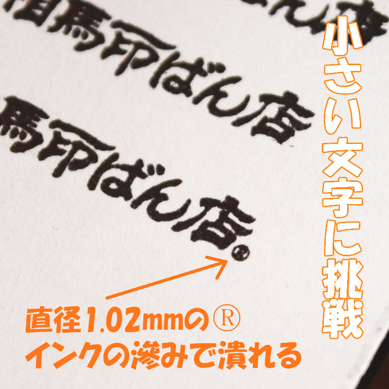 1m丸枠に“R”を入れた文字は作れましたが、コピー用紙に捺印するとインクの滲みで潰れます。これが、表面がツルツルしているロール紙や、吸水力のある紙なら印字できました。