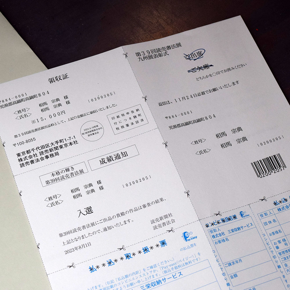 読売書法展の成績通知と、九州展での表彰式の出欠確認が届きましたので、出席で返送させて頂きました。
