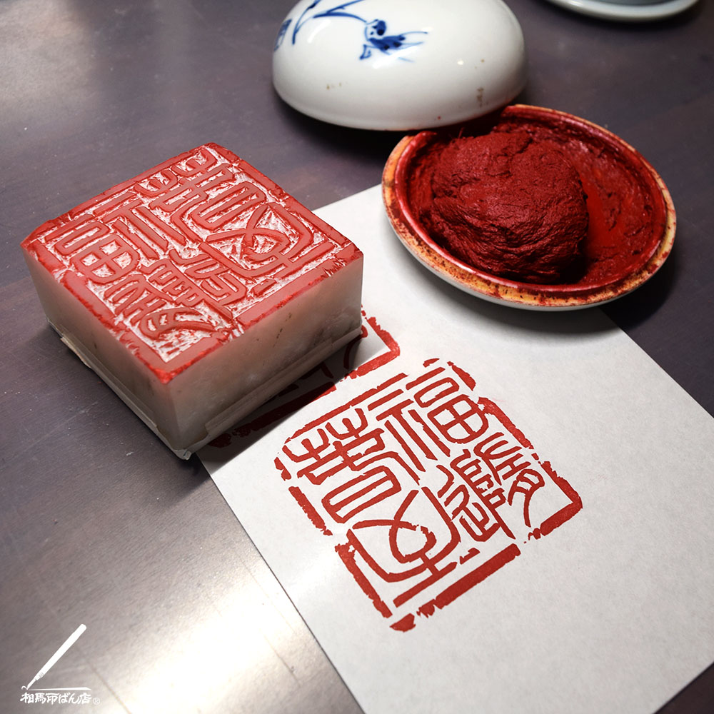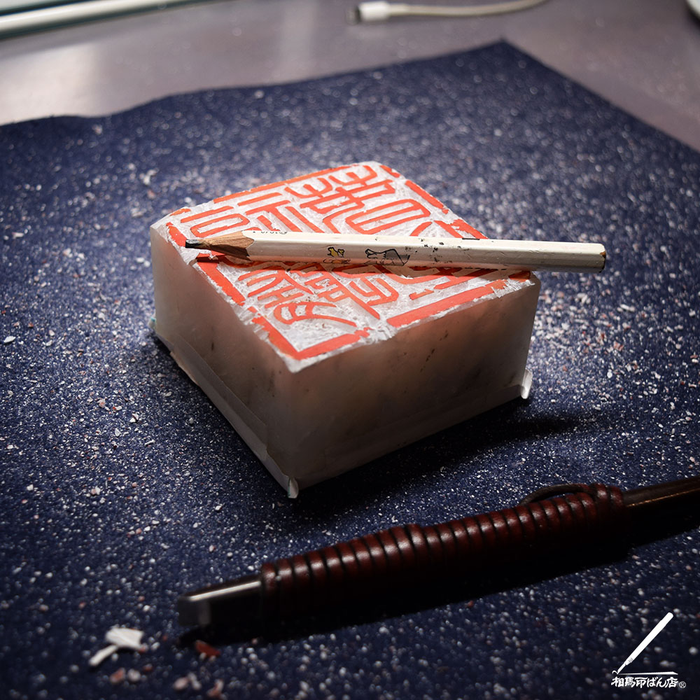 石を刻す段階では、ひと通り刻した後に捺印して、補刀(修正)を加え終えるまでだいたい1時間半ほどです。 今回は、刀を引く前に刀が食い込んではいけない部分に刀を引く線に対して直角になるように刀で切り込みを入れてから刀を引くようにしました。