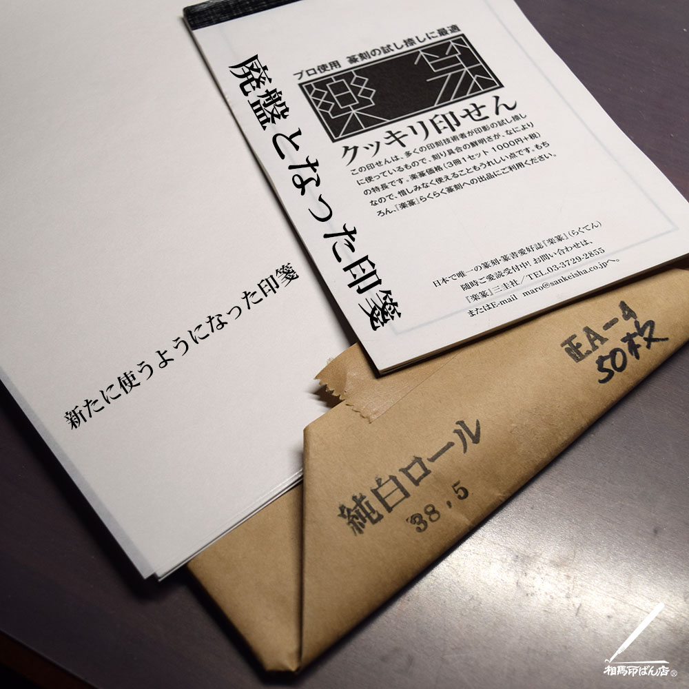 楽篆のくっきり印箋が廃盤となり、ストックしてた分が残り少なくなってきたので、先週、宮崎市にある川越紙店へ印箋を持参して、これに似た紙をA4サイズでカットして欲しいと注文したら、木曜日には届けて頂きました。